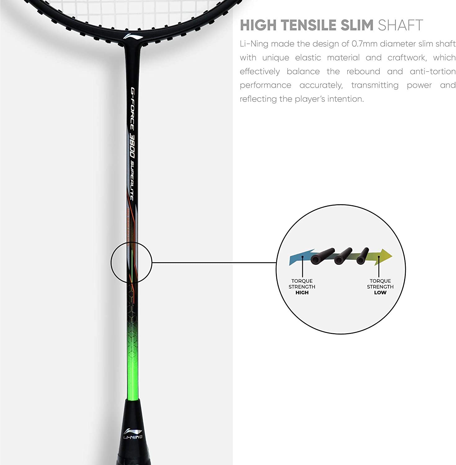 • Li-Ning g force series is made with strong material know as ultra carbon fiber. This material gives excellent rigidity to sustain impact load at very low weight