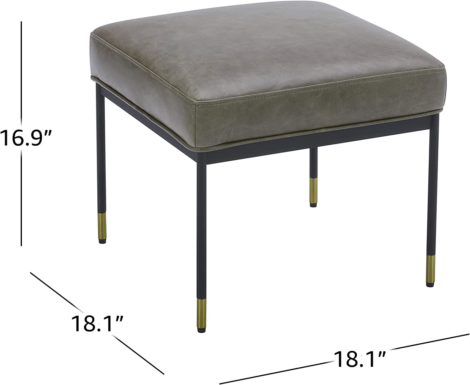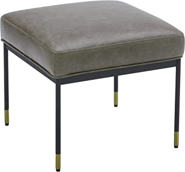 Studded Modern Leather Ottoman with Metal Legs, 16.9" Tall, Grey